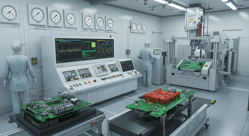 Գործընթացի ընթացքում վերահսկողությունը ներառում է արտադրական պարամետրերի (ջերմաստիճան, ճնշում, արագություն և այլն) շարունակական իրական ժամանակի մոնիթորինգ՝ օգտագործելով տրամաչափված սենսորներ և SPC (վիճակագրական գործընթացի կառավարում) համակարգեր՝ նախապես սահմանված թույլատրելի սահմաններից շեղումները անմիջապես հայտնաբերելու համար, միաժամանակ ավտոմատ կերպով գրանցելով տվյալները հետագծելիության և միտումների վերլուծության համար՝ անհամապատասխանությունները կանխելու համար՝ նախքան թերի արտադրանքի առաջացումը: