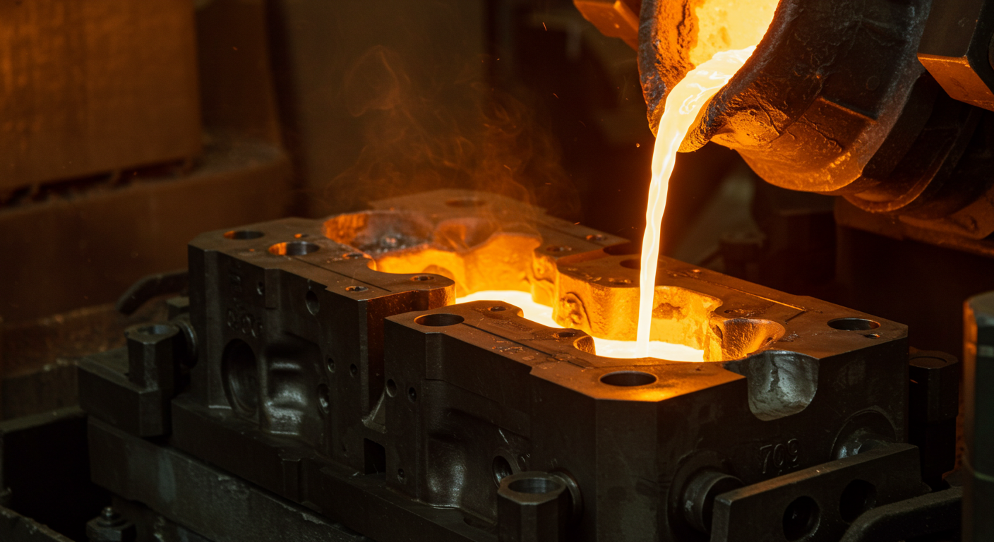 The molten metal is carefully poured into the prepared mold cavity to form the desired casting part. This critical phase requires precise control of: